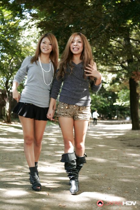 Japan HDV: Amazing girls Tsubasa and Kanon in shorts enjoy some playful lesbian foreplay outside