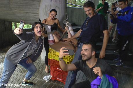 Public Disgrace: Asian cougar Satrina gets her amazing boobs & ass toyed by Steve Holmes & his slaves