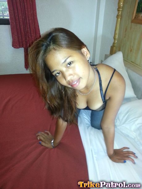 Trike Patrol: Asian teen Angel strips and shows her big melons and shaved pussy