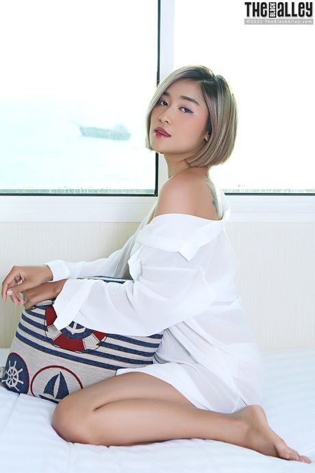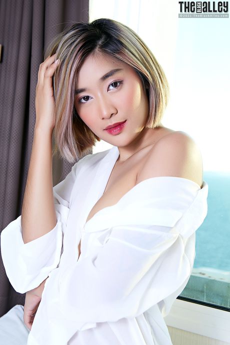 The Black Alley: Asian teen Apple shows her tiny tits and spreads her hairy pussy