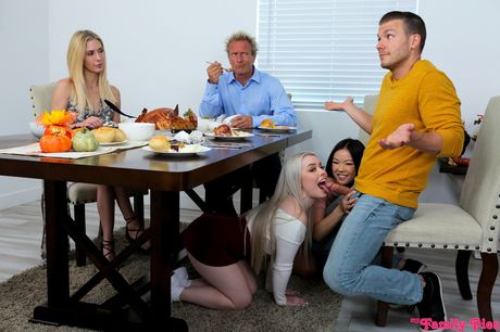 My Family Pies: Asian teens Haley Spades and Lulu Chu share a big dick in a kitchen 3some