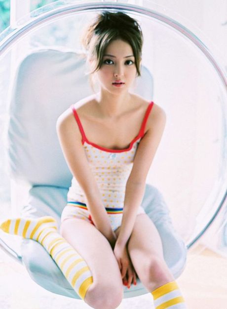 All Gravure: Long haired asian cutie having fun in a striped hot pink bikini