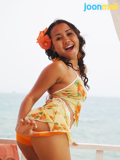 Joon Mali: Tropical island teen in orange shorts shows her bubble butt